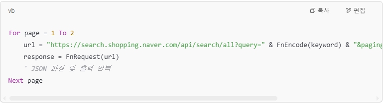 네이버 쇼핑 API는 pagingIndex 값을 변경하면 다음 페이지 요청이 가능합니다.